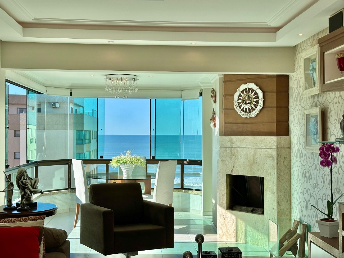 04 Dormitórios ( sendo 01 Suítes ) Lavabo Banho Social Living Integrado?Mobiliada Decorada 234, 19 M² privativos 316, 70 M² totais Climatizado Lareira Água quente e gás central Churrasqueira Forno Campeiro 02 terraços com vista eterna mar e banheira Jacuzzi 03 Box + 01 Depósito